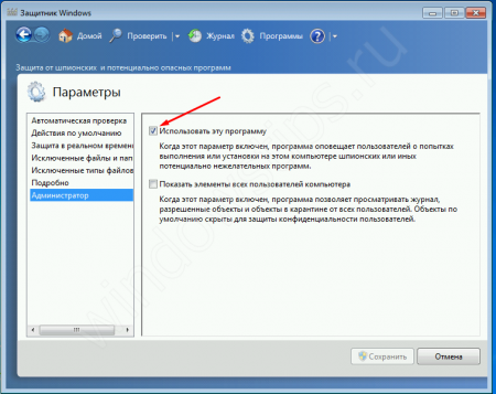 - Откройте Параметры и пройдите во вкладку Администратор. Чтобы Defender был включен, на пункте «Использовать эту программу» должна стоять галочка.