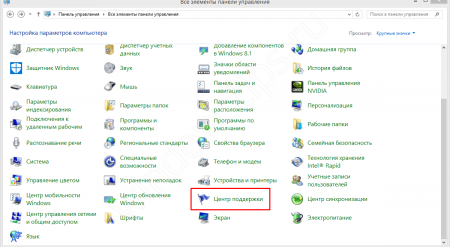 - Основные действия полностью повторяют алгоритм из 7-й версии системы, но есть небольшое отличие. Пройдите в Панель управления и откройте «Центр Поддержки»