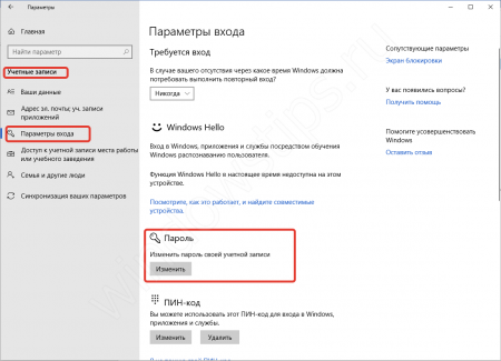 - Нажимаем на Пуск, Настройки, Учетные записи, Параметры входа. В настройках мы видим кнопку Изменить под словом Пароль, нажимаем на нее. Этот способ работает для локальной учетной записи и Майкрософт аккаунта.