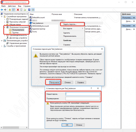 - Такой вариант подойдет для обладателей Windows 10 Pro, так как в домашней сборке такого нет. Открываем Управление компьютером через правую кнопку мыши на Пуске, переходим в Локальные пользователи, Пользователи. Выбираем локального пользователя, Задать и соглашаемся с уведомлением.
