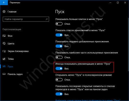 - Для начала, необходимо запретить самостоятельную загрузку и установку приложений из Магазина. Откройте Параметры – Персонализация – Пуск и отключите параметр “Иногда показывать рекомендации в меню Пуск”.