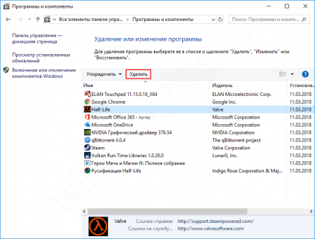 - В появившемся списке выберите необходимую программу и нажмите «Удалить».