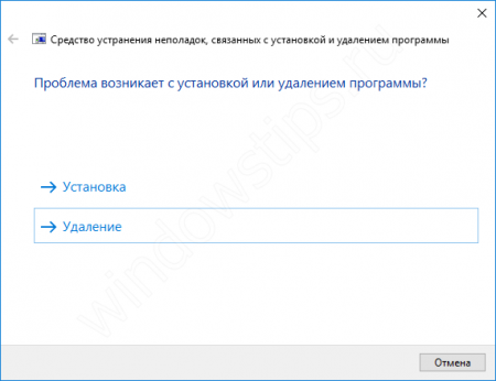 - Запустите средство и на этапе выбора типа проблемы, выберите Удаление.