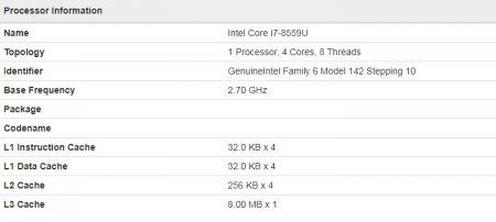 В частности, в данных Geekbench значится процессор Core i7-8559U. Этот 14-нанометровый чип содержит четыре вычислительных ядра с возможностью одновременной обработки до восьми потоков инструкций. Базовая тактовая частота составляет 2,7 ГГц, максимальная — 4,5 ГГц. Имеется интегрированный графический контроллер Intel Iris Plus Graphics 655.