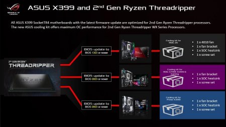 Процессоры AMD Ryzen Threadripper второго поколения, до выхода которых осталось не так много времени, будут выполнены в том же корпусе Socket TR4 и использовать тот же чипсет AMD X399, что и их предшественники первого поколения. Однако с увеличением числа ядер до 32 у новинок возрос и уровень TDP со 180 до 250 Вт. Увеличение TDP означает и увеличение энергопотребления, так что у некоторых актуальных материнских плат могут возникнуть трудности с подачей питания для новых процессоров, в частности, перегрев элементов подсистемы питания. Компании MSI и GIGABYTE по этому случаю уже представили новые улучшенные модели, а компания ASUS решила пойти иным путём. Тайваньский производитель анонсировал выпуск специальных комплектов для модификации своих актуальных материнских плат, которые получили название Cooling Kit. Как можно догадаться, данные комплекты предназначены для модификации системы охлаждения материнской платы, а точнее её подсистемы питания. Флагманская материнская плата ASUS ROG Zenith Extreme получит набор из 40-мм вентилятора, крепления для него и дополнительного радиатора, который устанавливается на элементы питания, расположенные под процессорным разъёмом. В свою очередь комплекты для плат ROG Strix X399-E Gaming и Prime X399-A будут лишены вентилятора, но благодаря наличию в комплекте крепления для него, пользователь сможет установить собственный, в случае необходимости. Пока что не известно, будет ли ASUS продавать вышеописанные комплекты отдельно, или же пользователи смогут получить их бесплатно, подтвердив факт покупки соответствующей платы. Пока что производитель рекомендует пользователям связаться со своим местным офисом.