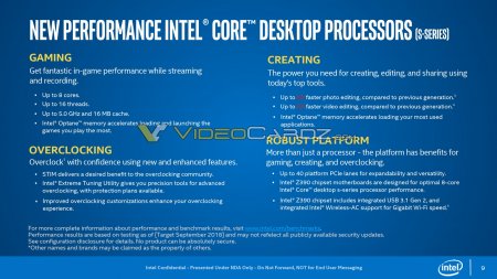 Процессоры Intel Core девятого поколения, известного под названием Coffee Lake Refresh, выйдут уже в октябре текущего года. Это семейство процессоров примечательно тем, что в нём появятся чипы с восемью вычислительными ядрами для массового настольного сегмента рынка. Но судя по новым официальным слайдам, компания Intel постарается привлечьпользователей не только этим.