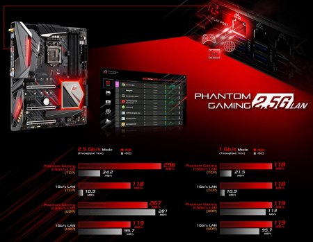 Другой примечательной особенностью плат серии Phantom Gaming станет наличие у них нестандартного сетевого интерфейса. Вместо привычного контроллера с пропускной способностью 1 Гбит/с, здесь использован новый Ethernet-контроллер Realtek Dragon RTL8125AG со скоростью до 2,5 Гбит/с.
