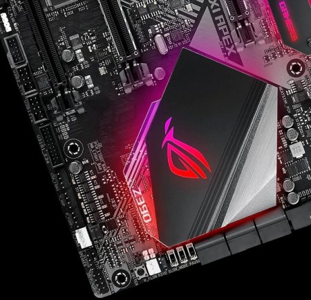 Новинка оснащена звуковой подсистемой на базе 8-канального кодека SupremeFX S1220. За сетевые подключения в Maximus XI Apex отвечает гигабитный контроллер Intel, а также беспроводной контроллер Intel, обеспечивающий работу Wi-Fi 802.11ac и Bluetooth 5. Также отметим наличие трёх портов USB 3.1 (два Type-A и один Type-C). Конечно же, не обошлось без RGB-подсветки, которой украшены радиаторы.