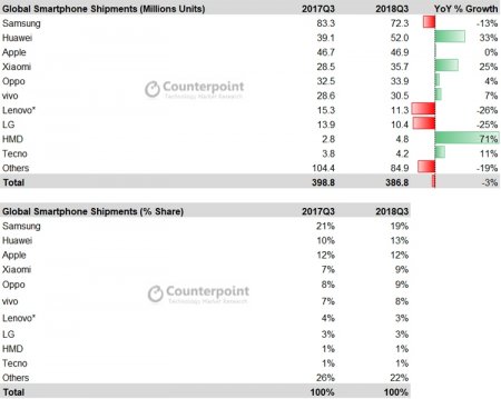 Компания Counterpoint Technology Market Research обнародовала результаты исследования мирового рынка смартфонов в третьей четверти текущего года. Сообщается, что в период с июля по сентябрь включительно в глобальном масштабе было реализовано 386,8 млн «умных» сотовых аппаратов. Это на 3 % меньше по сравнению с результатом годичной давности: тогда отгрузки равнялись 398,8 млн единиц. Лидером рынка остаётся Samsung с 72,3 млн поставленных смартфонов. При этом доля южнокорейского гиганта за год уменьшилась с 21 % до 19 %. Отмечается, что ведущие китайские поставщики активно укрепляют позиции. Так, на втором месте находится Huawei с 52,0 млн реализованных аппаратов. Доля компании в годовом исчислении выросла с 10 % до 13 %. Замыкает тройку Apple, отгрузившая за три месяца 46,9 млн смартфонов. Доля «яблочной» империи за год не изменилась — 12 %. В то же время квартальные поставки смартфонов Xiaomi, OPPO и Vivo бьют рекорды. Эти китайские компании за три месяца реализовали соответственно 35,7 млн, 33,9 млн и 30,5 млн аппаратов. Это соответствует долям в 9 %, 9 % и 8 %. В целом, десятка ведущих игроков рынка выглядит следующим образом: