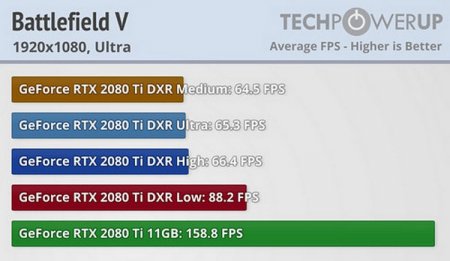 Разработчики игры Battlefield V выпустили новый патч, который добавил возможность активировать в игре трассировку лучей в реальном времени. Конечно же, данный патч наиболее интересен владельцам последних видеокарт NVIDIA GeForce RTX, так как он сделал Battlefield V первой игрой с поддержкой нового метода рендеринга. Не теряя времени ресурс TechPowerUp принялся за изучение влияния трассировки лучей на производительность. И влияние это оказалось весьма пагубным, мягко говоря. При разрешении Full HD (1920 ? 1080 точек) после активации режима DXR RayTrace Reflections с настройкой качества Ultra (максимальное использование трассировки) показатели частоты кадров, обеспечиваемые видеокартой GeForce RTX 2080 Ti, уменьшились более чем в два раза! В других режимах ситуация оказалась не лучше. При средних и высоких настройках «интенсивности» трассировки лучей наблюдаются примерно те же показатели в районе 65 кадров/с. Лишь в режиме низкого качества трассировки частота кадров оказались несколько выше (88,2 кадра/с), но всё равно это более чем на 40 % ниже частоты без трассировки лучей. Также источник отмечает, что в процессе тестирования иногда наблюдается нестабильность системы, вплоть до полного зависания и чёрного экрана. При этом скорость вращения вентиляторов видеокарты достигает 100 %. На данный момент в TechPowerUp тестируют трассировку лучей в реальном времени на других видеокартах NVIDIA серии GeForce RTX. Кстати, тестирование проводится с драйверами GeForce 416.94 WHQL на системе Windows 10 1809.