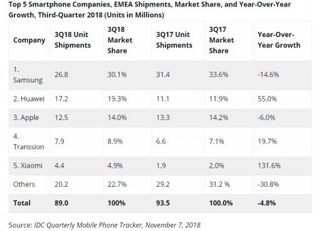 Компания International Data Corporation (IDC) обнародовала квартальную статистику по рынку смартфонов в регионе EMEA (Европа, включая Россию, Ближний Восток и Африка). В третьей четверти текущего года отгрузки «умных» сотовых аппаратов в регионе EMEA составили 89,0 млн штук. Это на 4,8 % меньше прошлогоднего результата, когда поставки равнялись 93,5 млн единиц. В то же время продажи в денежном выражении поднялись более чем на 10 %, достигнув $29,8 млрд. Крупнейшим игроком на рынке EMEA является Samsung с 26,8 млн реализованных смартфонов и долей в 30,1 %. Годом ранее южнокорейская компания занимала 33,6 % отрасли. Активно укрепляют позиции китайские поставщики. Так, находящаяся на втором месте Huawei отгрузила за три месяца 17,2 млн смартфонов, увеличив долю в годовом исчислении с 11,9 % до 19,3 %. «Бронза» досталась Apple с 12,5 млн проданных iPhone. Доля компании за год уменьшилась с 14,2 % до 14,0 %. На четвёртом месте в регионе EMEA находится китайский производитель Transsion (марки iTel Mobile, Tecno Mobile и Infinix Mobile). Компания реализовала в течение квартала 7,9 млн смартфонов. Доля составила 8,9 % против 7,1 % годом ранее. Замыкает пятёрку китайская Xiaomi с 4,4 млн проданных аппаратов. За год доля этой компании подскочила более чем в два раза — с 2,0 % до 4,9 %.