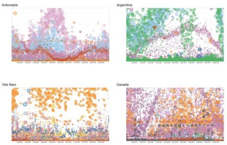Для создания простой, понятной и наглядной «картины из трафика» дизайнеры использовали информацию о скорости передачи данных в отдельных странах и регионах, размерах файлов, точек, между которыми передавался трафик и еще кучу параметров.