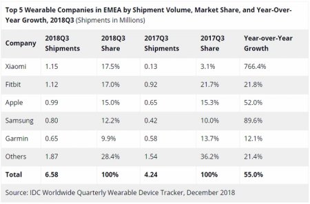 В третьей четверти нынешнего года на рынок EMEA было поставлено 6,58 млн носимых гаджетов. Это на 55 % больше прошлогоднего результата, когда отгрузки равнялись 4,24 млн единиц.