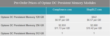 Судя по выставленным для оформления предварительного заказа ценам, а эти цены пока могут быть достаточно далеки от рекомендуемых компанией Intel, модули Optane DC ёмкостью 128 Гбайт стоят $842–$893, а модули Optane DC 256 Гбайт оценены в $2668–$2850. Тем самым стоимость одного гигабайта памяти Intel Optane в модулях DDR4 начинается от $6,57 за Гбайт, что примерно равно стоимости одного гигабайта обычной оперативной памяти в модулях DDR4.