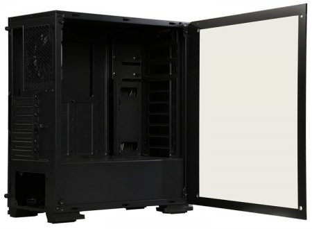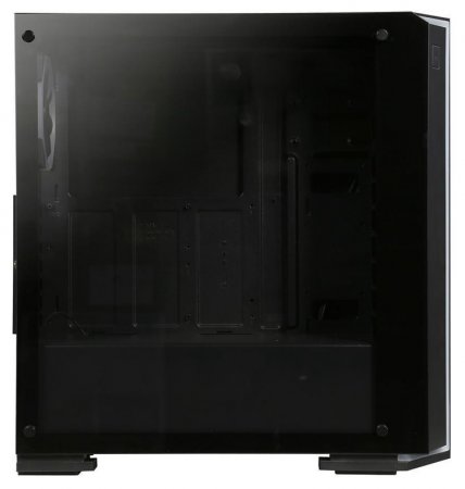 Новинка выполнена в чёрном цвете, а боковая стенка изготовлена из закалённого стекла. Фронтальную панель пересекает по вертикали полоса RGB-подсветки.
