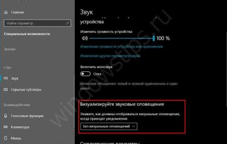 - Откройте вкладку «Звук» и для значения «Визуализируйте звуковые оповещения» выставьте «Без визуальных оповещений»