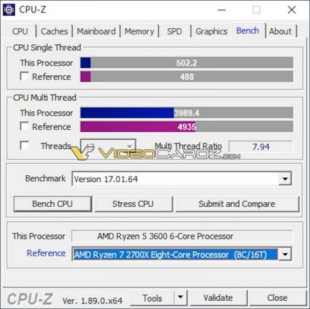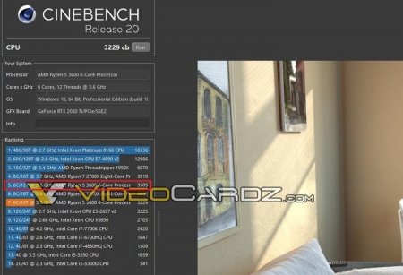 приводит результаты тестирования ещё не вышедшего Ryzen 5 3600 в тестах производительности Cinebench R15 и Cinebench R20, а также во встроенном бенчмарке утилиты CPU-Z. Кроме того, были опубликованы скриншоты из самой утилиты CPU-Z, согласно которым процессор тестировался с памятью DDR4-3200.