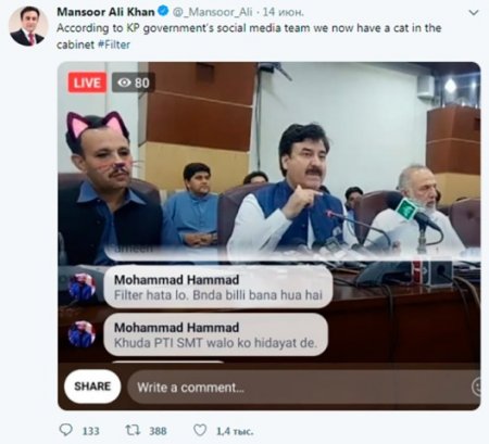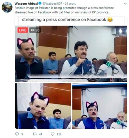 «Вы не сможете превзойти это! Пресс-конференция правительства Хайбер-Пахтунхвы на Facebook с кошачьим фильтром», — заметила журналистка Наила Инаят.