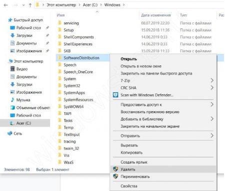 При этом должна быть отключена служба обновления Windows. Чтобы не лезть в настройки, перезагрузите ПК и удалите указанную папку.