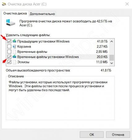 Для удаления выберите пункты “Предыдущие установки Windows” и “Временные файлы установки Windows”.