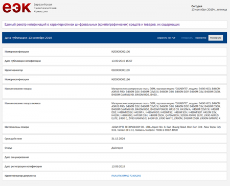 В едином реестре нотификаций Евразийской Экономической Комиссии появились сведения о материнских платах компании Gigabyte, ориентированных на работу с перспективными процессорами Intel Comet Lаke-S, которые должны будут появиться на рынке в начале 2020 года. Список плат, на которые производитель получил нотификации, включает в себя 35 изделий, основанных на пока не анонсированных наборах системной логики H410, B460, Q470, H470 и Z490.