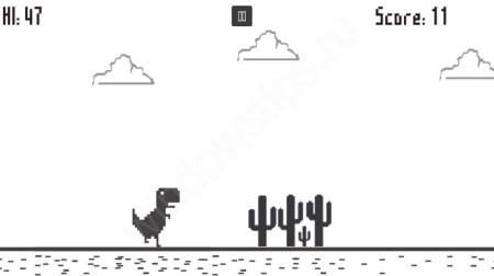 Чтобы играть в Динозавра в Гугл Хром, достаточно зайти в браузер. Если вы пытаетесь открыть страницу в веб-проводнике, а Интернета нет, появляется Динозаврик. Он начинает бежать сразу после нажатия на пробел. Суть игры для Гугл Хром незамысловата — перепрыгивать через препятствия. В некоторых случаях необходимо пригнуться. Таким образом, главный герой умеет делать только три вещи — бежать, прыгать и пригибаться. Управление осуществляется с помощью стрелки на клавиатуре (вниз), а также пробела.
