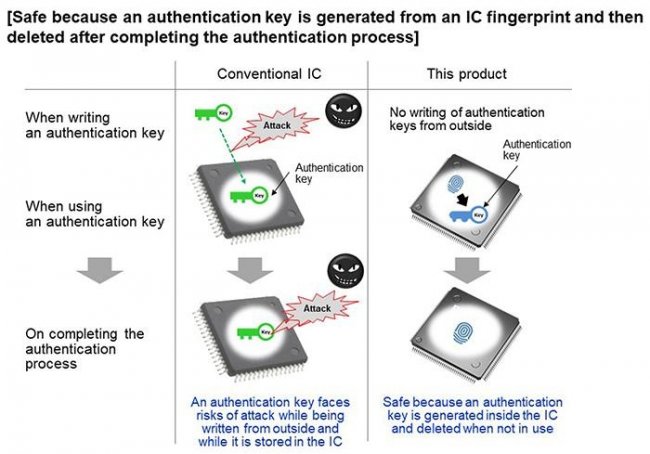 Что касается основных функций микроконтроллера Panasonic, то он обладает повышенной защитой от взлома и кражи данных. Решение будет применяться в промышленных устройствах и в широком спектре инфраструктуры. В каждый чип встроен уникальный аналоговый идентификатор - нечто похожее на отпечаток пальца человека. С помощью этого «отпечатка» будет генерироваться уникальный ключ для аутентификации чипа в сети и для передачи (съёма) данных с него. Ключ никогда не выйдет наружу и будет уничтожаться сразу после прохождения аутентификации, что защитит от перехвата ключа в памяти контроллера.
