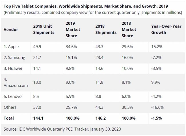 За 2019 год в целом в мире было поставлено 144,1 млн планшетных компьютеров. Падение по отношению к 2018-му составило 1,5 %. В тройку лидеров входят Apple, Samsung и Huawei с долями соответственно 34,6 %, 15,1 % и 9,8 %.