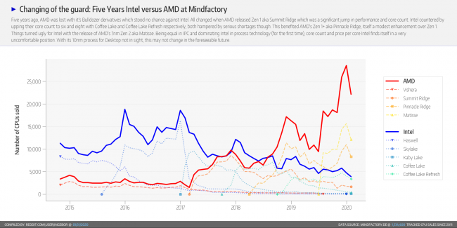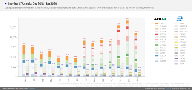 Популярный в Германии интернет-магазин MindFactory продолжает выступать главным свидетелем успеха процессоров AMD в новейшей истории. По итогам января объёмы реализации процессоров предсказуемо сократились, но в относительном выражении на долю продукции AMD всё равно пришлось 85 %.