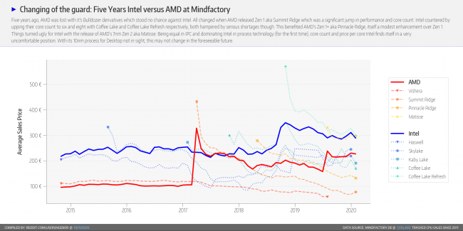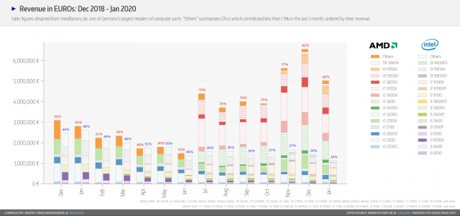 Квартальный отчёт Intel заставил руководство компании признаться, что объёмы реализации настольных процессоров за 2019 год сократились на 6 %, хотя средняя цена при этом выросла на 3 %. Если же рассматривать в отдельности динамику второго полугодия, то средняя цена реализации настольных процессоров Intel неуклонно снижалась. Все эти тенденции отразились и на статистике немецкого интернет-магазина MindFactory.de. Можно лишь отметить, что в натуральном выражении доля продукции AMD по сравнению с декабрём сократилась с 86 % до 85 %.