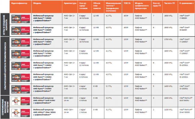 В январе компания AMD представила 7-нм гибридные процессоры Renoir, разделив их по признаку энергопотребления на две серии: Ryzen 4000H (45 Вт) и Ryzen 4000U (15 Вт). Ноутбукам попроще были адресованы 14-нм процессоры семейства Dali. Теперь AMD готова назвать потенциальных конкурентов для этих процессоров среди изделий Intel. Информация сайта - «print-prime.ru» Маркетинговые материалы AMD регулярно пересматривают конкурентное позиционирование собственной продукции относительно изделий основного соперника. Иногда это происходит с некоторым запозданием, но в посвящённой мобильным процессорам AMD текущего модельного года брошюре компания выбирает в качестве соперников процессоры Intel семейств Comet Lake-H, Ice Lake-U, Whiskey Lake и Gemini Lake. Из всех перечисленных только Ice Lake выпускаются по передовому 10-нм техпроцессу, остальные хранят верность «старому доброму» 14-нм. Информация сайта - «print-prime.ru» С двумя старшими процессорами Renoir всё просто — они должны противостоять 14-нм процессорам Comet Lake-H с аналогичным уровнем TDP не более 45 Вт. Оба семейства процессоров должны применяться для создания игровых ноутбуков. Компания Intel пообещала к середине года начать поставки 10-нм процессоров Tiger Lake, но среди них будут лишь модели с четырьмя ядрами и умеренным энергопотреблением. По идее, в течение года процессоры Tiger Lake-U должны принять эстафету у Ice Lake-U, которые пока признаны конкурентами основной части ассортимента процессоров AMD Ryzen 3000U. С экономичными процессорами AMD Dali всё обстоит иначе: модель Athlon Gold 3150U выбрана в качестве соперника Intel Pentium Gold 5405U семейства Whiskey Lake-U, а двухъядерному процессору Athlon Silver 3050U призван противостоять четырёхъядерный Pentium Silver N5000 семейства Gemini Lake. В целом, как отмечается в маркетинговой брошюре AMD, мобильные процессоры Athlon должны стать основой для «современных массовых ноутбуков».