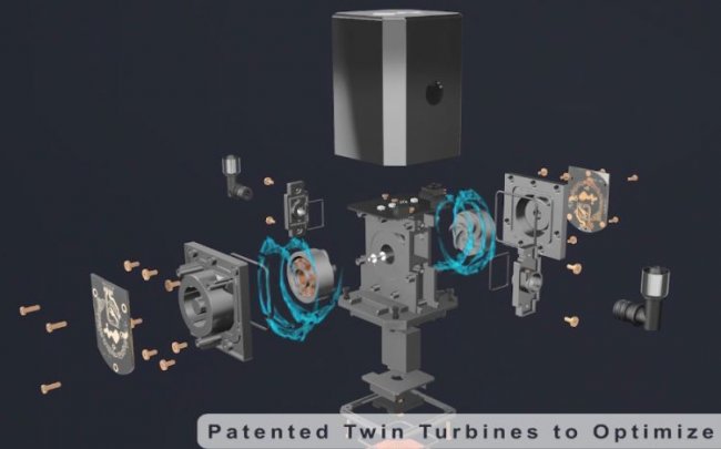 InWin утверждает, что запатентовала конструкцию помпы с двумя турбинами, приводимыми в движение одним электродвигателем. Они сначала направляют поток жидкости к медному основанию водоблока, которое содержит микроканалы с внутренней стороны, а затем отводят нагретую жидкость по трубопроводу к радиатору с вентиляторами. Скорость вращения вала помпы составляет 2400 об/мин. Если одна из турбин выйдет из строя, система охлаждения продолжит работать со сниженной производительностью, но на крышке водоблока появится световая индикация, символизирующая о неисправности.