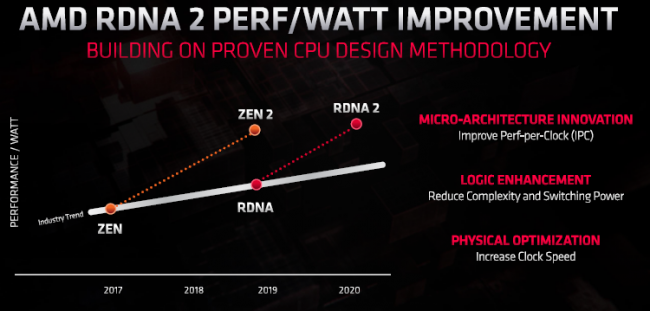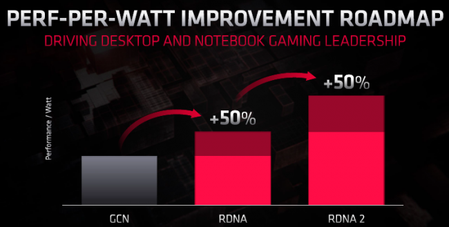 Многие из слайдов профильной презентации поясняют, что в рамках архитектуры RDNA 2 компании удалось добиться прироста производительности в пересчёте на ватт в полтора раза по сравнению с графическими решениями предыдущего поколения. Около 60 % этого прироста, по словам представителей AMD, обеспечено микроархитектурными улучшениями, чуть больше 20 % прироста обеспечивает усовершенствованный 7-нм техпроцесс, оставшееся преимущество — это заслуга улучшения частотного потенциала и энергопотребления за счёт компоновочных решений при разработке графических процессоров.