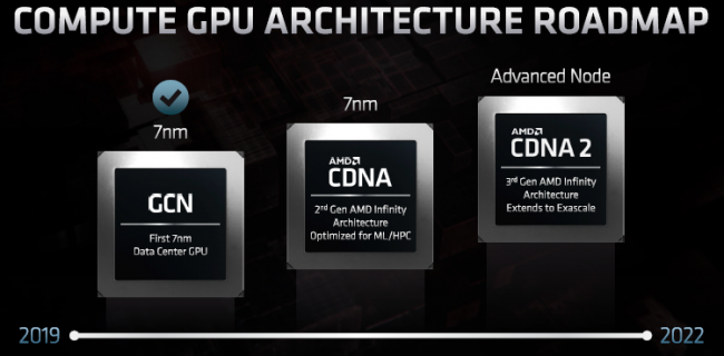 В рамках 7-нм технологии произойдёт расщепление эволюционных путей развития графических архитектур AMD. От игровой RDNA отделится серверная CDNA, которая нацелена на работу с ускорением вычислений. Она будет активно использовать архитектуру Infinity для повышения эффективности обмена данными между разнородными компонентами.