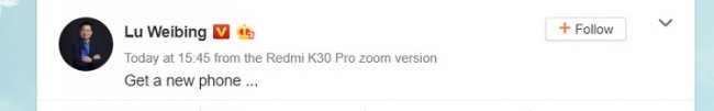 Прямого заявления от главы компании не поступало, однако подписчики Вейбина на Weibo, популярном в Китае сайте для ведения микроблогов, вскоре заметили, что пост, гласящий “Get a new phone …” (Получил новый телефон…), опубликован с устройства, идентифицированного как Redmi K30 Pro zoom version. Дата презентации смартфона не названа, но есть вероятность, что устройство будет показано вместе с базовой версией Redmi K30 Pro.