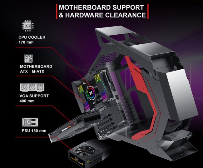 Основные комплектующие монтируются под наклоном. Возможна установка материнских плат типоразмера E-ATX, ATX, Micro-ATX и Mini-ITX. Длина дискретных графических ускорителей может достигать 400 мм.