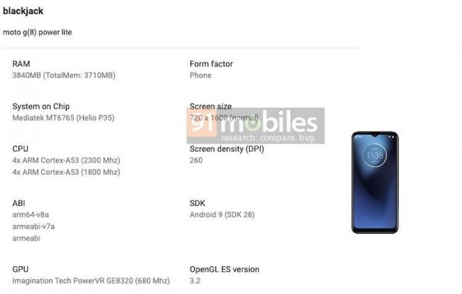 В базе Google Play Console появилась информация о технических характеристиках смартфона среднего уровня Moto G8 Power Lite: о грядущем анонсе этого аппарата мы уже сообщали ранее. Стало известно, что «сердцем» устройства послужит процессор MediaTek Helio P35. Это изделие объединяет восемь вычислительных ядер ARM Cortex-A53 с тактовой частотой до 2,3 ГГц. За обработку графики отвечает интегрированный ускоритель IMG PowerVR GE8320. В арсенале смартфона — 4 Гбайт оперативной памяти. Указано разрешение дисплея — 1600 ? 720 точек, что соответствует формату HD . Как можно видеть на изображении, экран аппарата получит небольшой вырез в верхней части: здесь расположится одинарная фронтальная камера. В оснащение войдёт многокомпонентная тыльная камера. Питание обеспечит аккумуляторная батарея ёмкостью 5000 мА·ч. Смартфон сможет функционировать в мобильных сетях 4G LTE; упомянута поддержка двух SIM-карт. В качестве программной платформы значится операционная система Android 9.0 Pie, но коммерческая версия, скорее всего, будет предлагаться с Android 10 «из коробки». Среди прочего упомянуты симметричный порт USB Type-C и дактилоскопический сканер в тыльной части корпуса. Сведений об ориентировочной цене на данный момент нет.