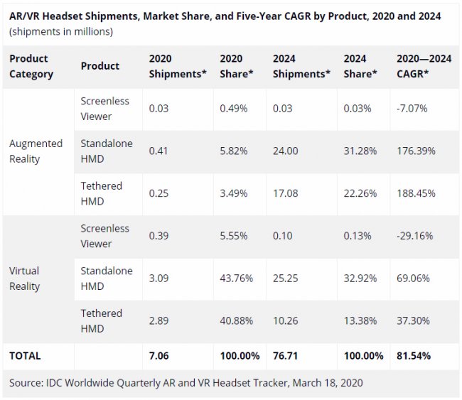 Аналитики International Data Corporation (IDC) прогнозируют, что в текущем и следующем кварталах мировой рынок устройств дополненной (AR) и виртуальной (VR) реальности покажет существенный спад. Причина — пандемия коронавируса, охватившая многие страны по всему миру. Эксперты полагают, что в первой четверти 2020-го объём глобальной AR/VR-отрасли сократится в штучном выражении на 10,5 % по сравнению с аналогичным периодом 2019-го. Во втором квартале ожидается снижение поставок практически на четверть — на 24,1 %. Но уже во втором полугодии 2020-го рынок при благоприятном стечении обстоятельств начнёт восстанавливаться. В результате, по итогам года в целом по всему миру будут реализованы 7,1 млн AR/VR-устройств. Если этот прогноз оправдается, рост по отношению к 2019-му составит 23,6 %. Среднегодовой темп роста в сложных процентах (показатель CAGR) в период до 2024-го ожидается на уровне 81,5 %. Таким образом, полагает IDC, в 2024 году поставки достигнут 76,7 млн единиц. В текущем году на устройства виртуальной реальности разного типа придётся около 90 % в общем объёме поставок. В 2024-м этот показатель снизится до 46 %.