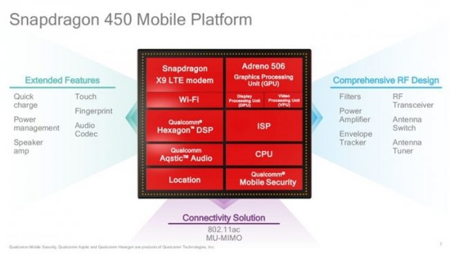 «Сердцем» послужит процессор Qualcomm Snapdragon 450. Чип содержит восемь вычислительных ядер ARM Cortex-A53 с тактовой частотой до 1,8 ГГц, интегрированный контроллер Adreno 506 для обработки графики и модем LTE со скоростью передачи данных до 300 Мбит/с.