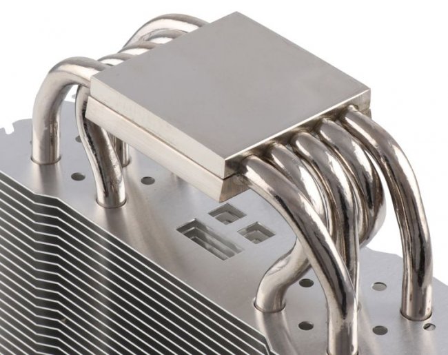 Сам радиатор имеет скромную глубину — не более 42 мм без учёта вентилятора, его ширина не превышает 120 мм, а высота — 158 мм. От медного основания с никелевым покрытием отходят пять тепловых трубок U-образной формы стандартного диаметра 6 мм. При взгляде на радиатор со стороны вентилятора заметно, что стволы тепловых трубок разнесены таким образом, что две крайние пронизывают радиатор ближе к внешнему краю, две ближайшие к центральной трубке пронизывают радиатор ближе к его центру, а средняя тепловая трубка располагается где-то между ними.
