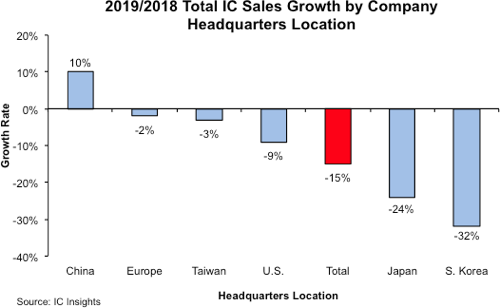 Что касается динамики продаж на мировом рынке полупроводников, то за год выручка компаний, так или иначе связанных с проектированием решений, сократилась на 15 %. Годовой рост показал только Китай (+10 %), а Южная Корея продемонстрировала самое значительное снижение - на 32 %. Но это всё память, которая в 2019 году быстро упала в цене.