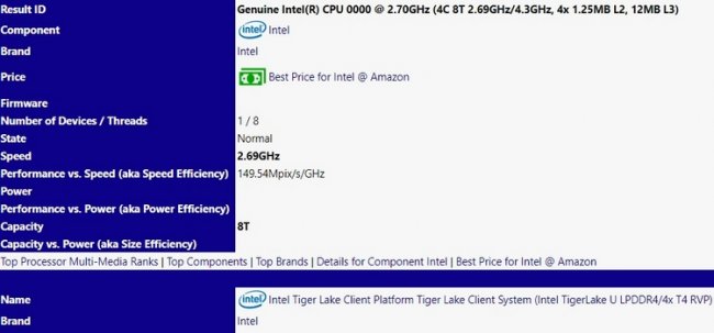 Известный источник утечек с псевдонимом Tum_Apisak нашёл в базе данных бенчмарка SiSoftware свежую запись о тестировании одного из процессоров Tiger Lake-U. Согласно тесту, он обладает четырьмя ядрами и восемью потоками. Напомним, в этих процессорах Intel использует ядра со свежей архитектурой Willow Cove и встроенную графику двенадцатого поколения с архитектурой Intel Xe. Отметим и увеличенную до 12 Мбайт кеш-память третьего уровня, то есть в расчёте на ядро её объём вырос на 50 %.