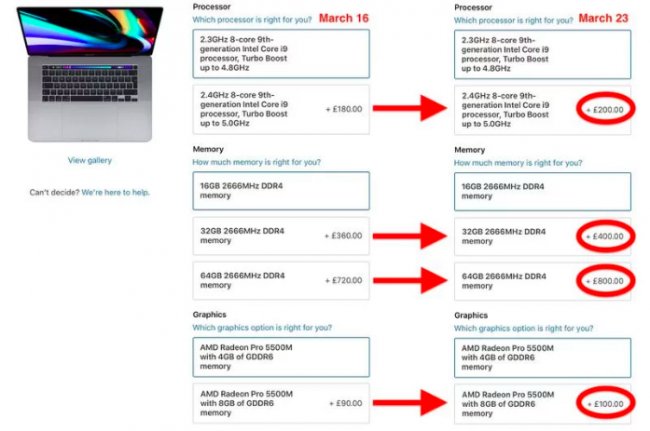 Например, в Великобритании, при заказе 16-дюймового MacBook Pro с 8-ядерным процессором с частотой 2,4 ГГц вместо базовой комплектации с процессором, имеющим тактовую частоту 2,3 ГГц, покупателю придётся доплатить 200 фунтов стерлингов, хотя ещё неделю назад такой апгрейд обошёлся бы в 180 фунтов стерлингов.
