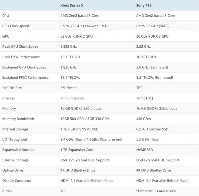 Напомним: Xbox Series X имеет на 44 % больше вычислительных блоков (52 CU @1,825 ГГц) с теоретической производительностью в 12 терафлопс и 8-ядерный 16-поточный процессор Zen 2 с более высокой тактовой частотой в 3,8 ГГц (3,6 ГГц в режиме SMT). PS5, в свою очередь, может предложить аналогичный процессор с частотой до 3,5 ГГц и графику с производительностью до 10,3 терафлопс (36 CU @2,23 ГГц). Но есть нюанс: если процессор работает на максимуме, частота ГП снижается и в реальности устойчивая производительность FP32 для консоли Sony ожидается в районе 9 терафлопс.