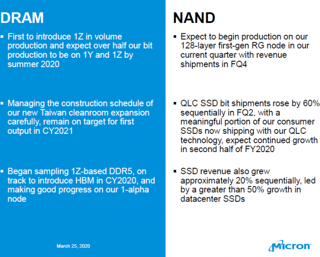 Квартал Micron завершил с $4,8 млрд выручки, что на 18 % меньше итогов аналогичного периода прошлого года. Микросхемы оперативной памяти определяли выручку Micron на 64 %, на этом направлении она сократилась на 26 % в годовом сравнении, хотя в натуральном выражении объёмы поставок продукции выросли на 20 %. Твердотельная память определяла совокупную выручку Micron на 36 %, здесь в годовом сравнении наблюдался рост на 9 %, объёмы поставок выросли на 20 %, а средняя цена реализации увеличилась на 8–9 % по сравнению с предыдущим кварталом.