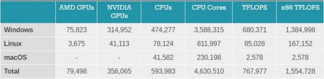 Число систем, задействованных в Folding@Home постоянно меняется, собственно как и производительность. Достижение 1,5 экзафлопса распределённой сети обеспечили 4,63 млн процессорных ядер и 430 тыс графических процессоров AMD и NVIDIA. В большинстве своём это системы на Windows, хотя также немалую часть составляют и Linux-системы, а вот компьютеры на macOS могут задействовать только CPU, поэтому их вклад не столь значителен.