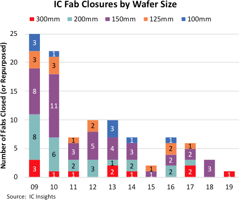 На днях аналитики компании IC Insights опубликовали статистику закрытия или переориентации заводов по обработке кремниевых пластин. Консолидация бизнеса и переход компаний на бесфабричную, или на облегчённую фабричную модель ведения бизнеса привели к массовому закрытию заводов с устаревшим оборудованием. Этому также способствовал рост спроса на техпроцессы с нормами менее 20 нм, внедрение которого было невозможно или нерентабельно на пластинах малого диаметра.