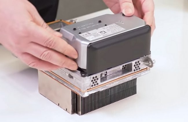 Платы крепятся с двух сторон алюминиевого шасси, которое формально также можно считать частью системы охлаждения. Главная же часть охладителя Xbox Series X — массивный алюминиевый радиатор с медной испарительной камерой в основании, который устанавливается на однокристальную платформу и микросхемы памяти. Завершает картину довольно крупный вентилятор, установленный в верхней части консоли, который обеспечивает сквозное движение воздуха в корпусе снизу вверх.