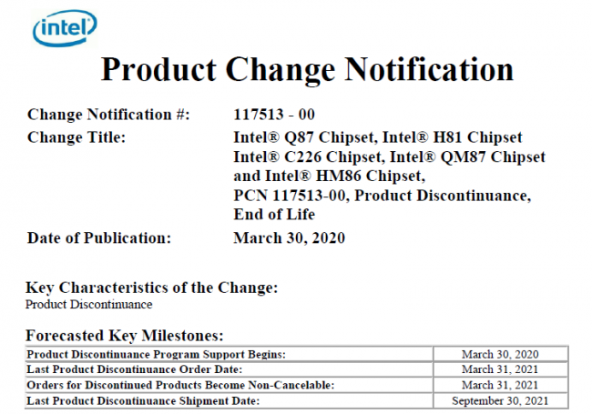 Ещё год назад наборы логики Intel Q87, Intel H81, Intel C226, Intel QM87 и Intel HM86 упоминались в производственной программе предприятия компании во Вьетнаме, а теперь Intel заявляет о запуске процесса по прекращению поставок этих изделий. Intel Q87 и H81 — это настольные продукты, Intel QM87 и HM86 — мобильные, а Intel C226 — это набор логики для рабочих станций.