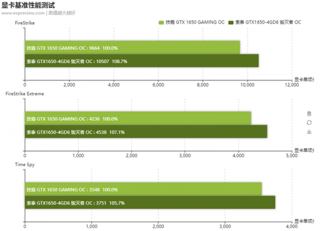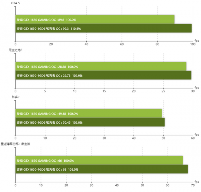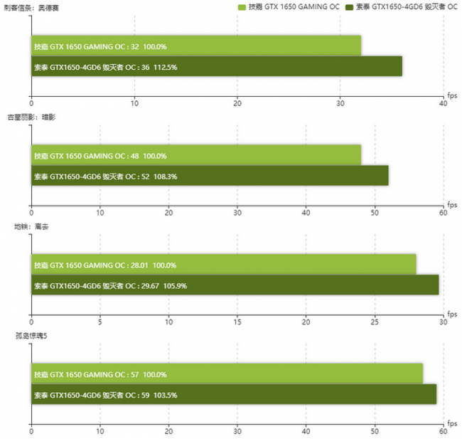 Китайские обозреватели сравнили видеокарту Zotac GeForce GTX 1650 Destroyer OC с памятью GDDR6 с обычной Zotac GeForce GTX 1650 Gaming OC. Сообщается, что в синтетических бенчмарках новая модель оказывается на 5–8 % производительнее. В играх же прирост составляет от 2 до 10 %, даже несмотря на более низкие тактовые частоты. Интересно, что за счёт использования более эффективной памяти GDDR6 энергопотребление видеокарты снизилось с 83 до 76 Вт.